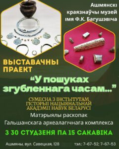 З 30 студзеня па 15 сакавіка 2026 г. запрашаем наведаць выставачны праект «У пошуках згубленага часам», арганізаваны сумесна з Інстытутам гісторыі Нацыянальнай Акадэміі Навук Беларусі. На выставе прадстаўлены матэрыялы археалагічных раскопак Гальшанскага археалагічнага комплексу, які ўключае ў сябе: гарадзішча, малое гарадзішча, шэсць селішчаў, шэраг курганных пахаванняў і грунтовыя могільнікі.